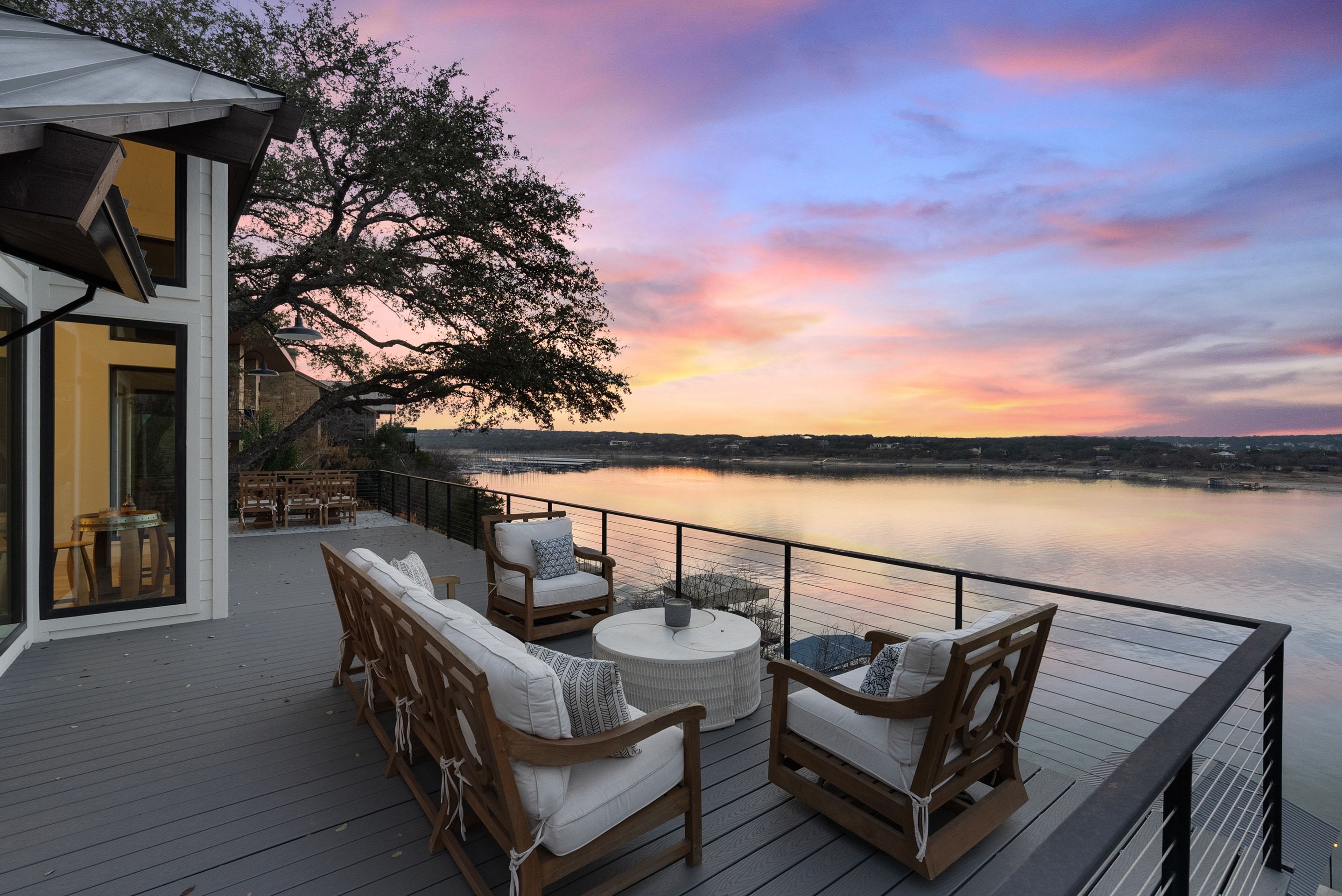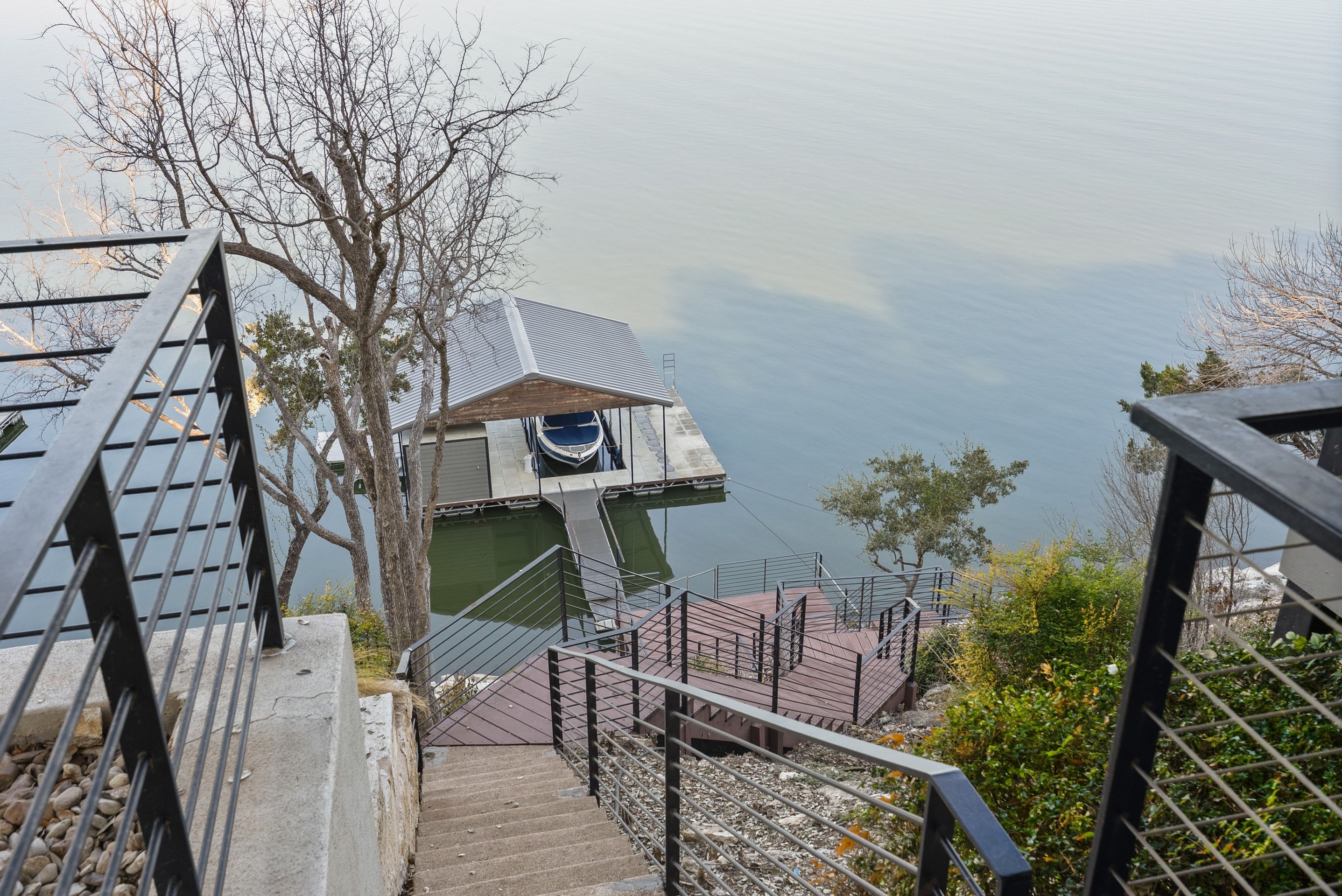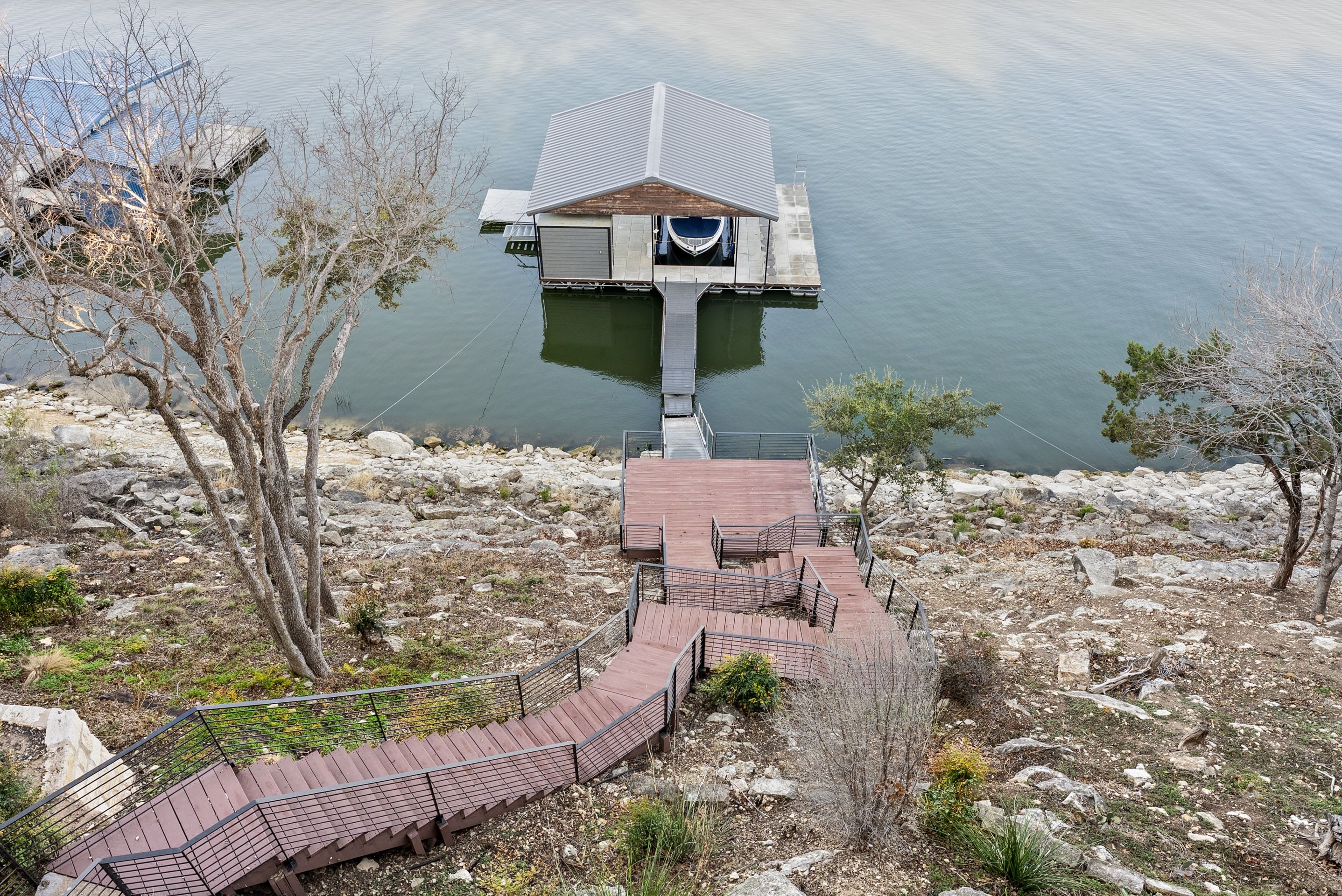 Set along the shoreline of Lake Travis, this property offers an impressive 176 feet of improved waterfront complete with a floating dock and convenient trolley access, making time on the water effortless. Wide open lake views stretch across the horizon, creating a setting designed for both quiet mornings and unforgettable sunset evenings.