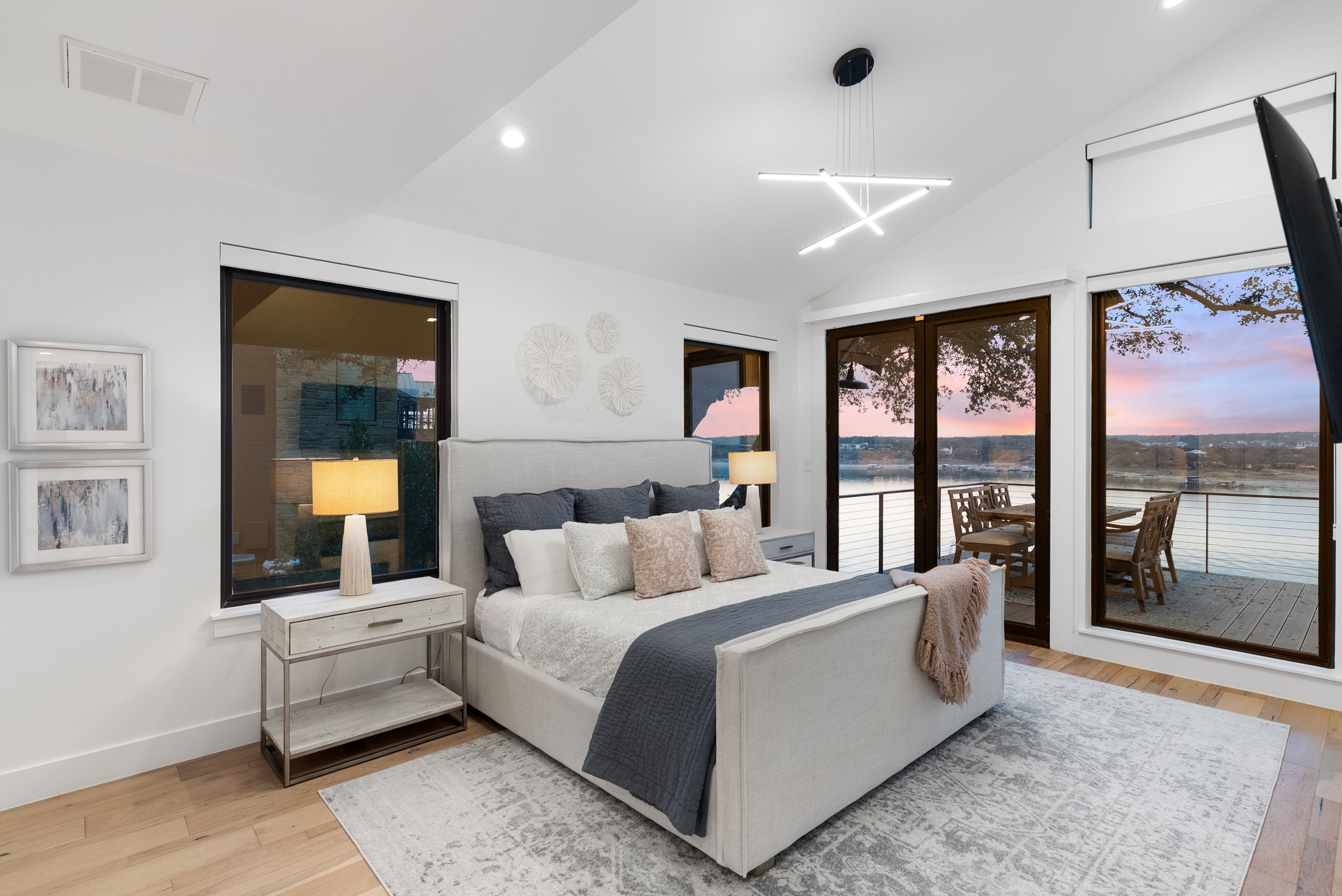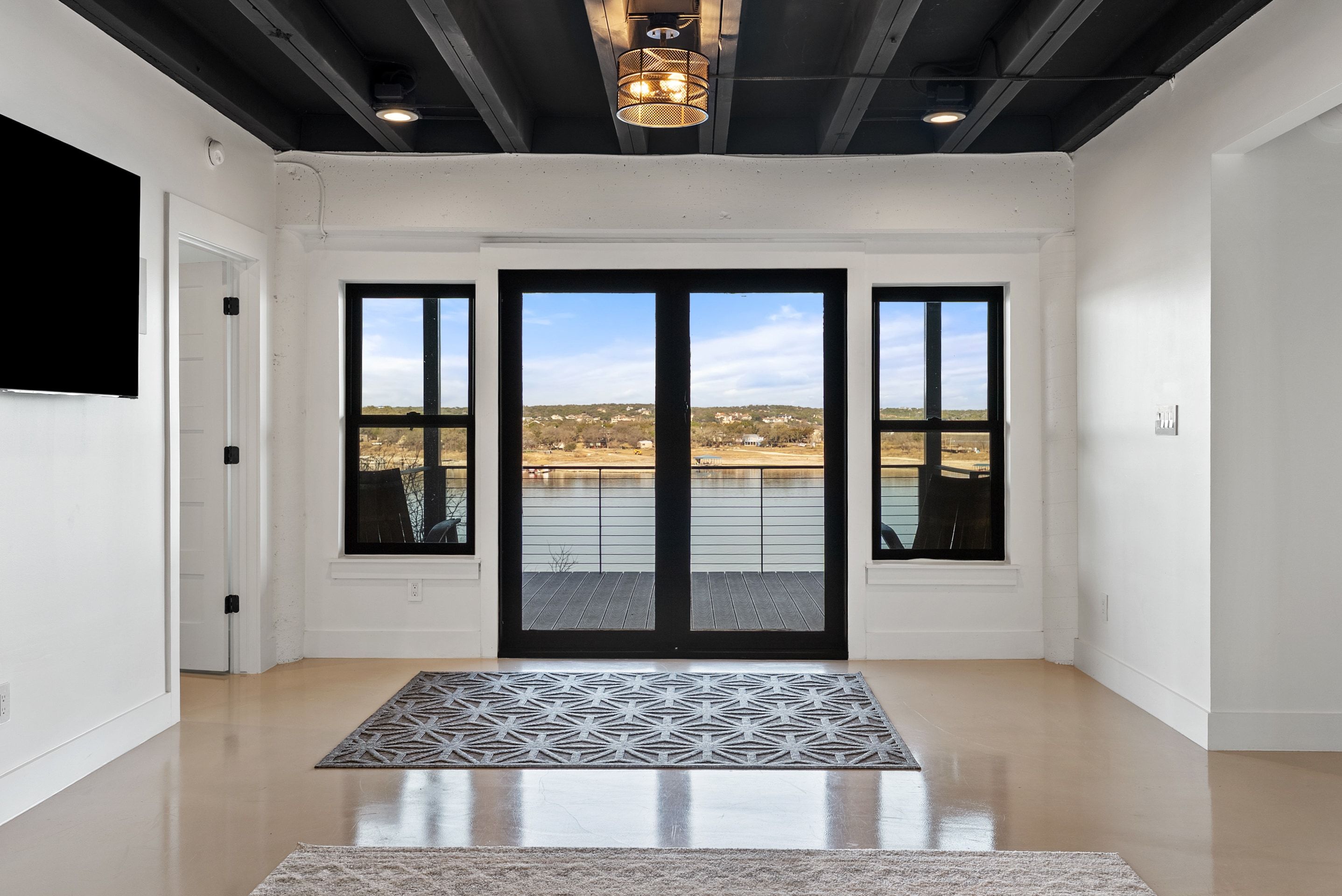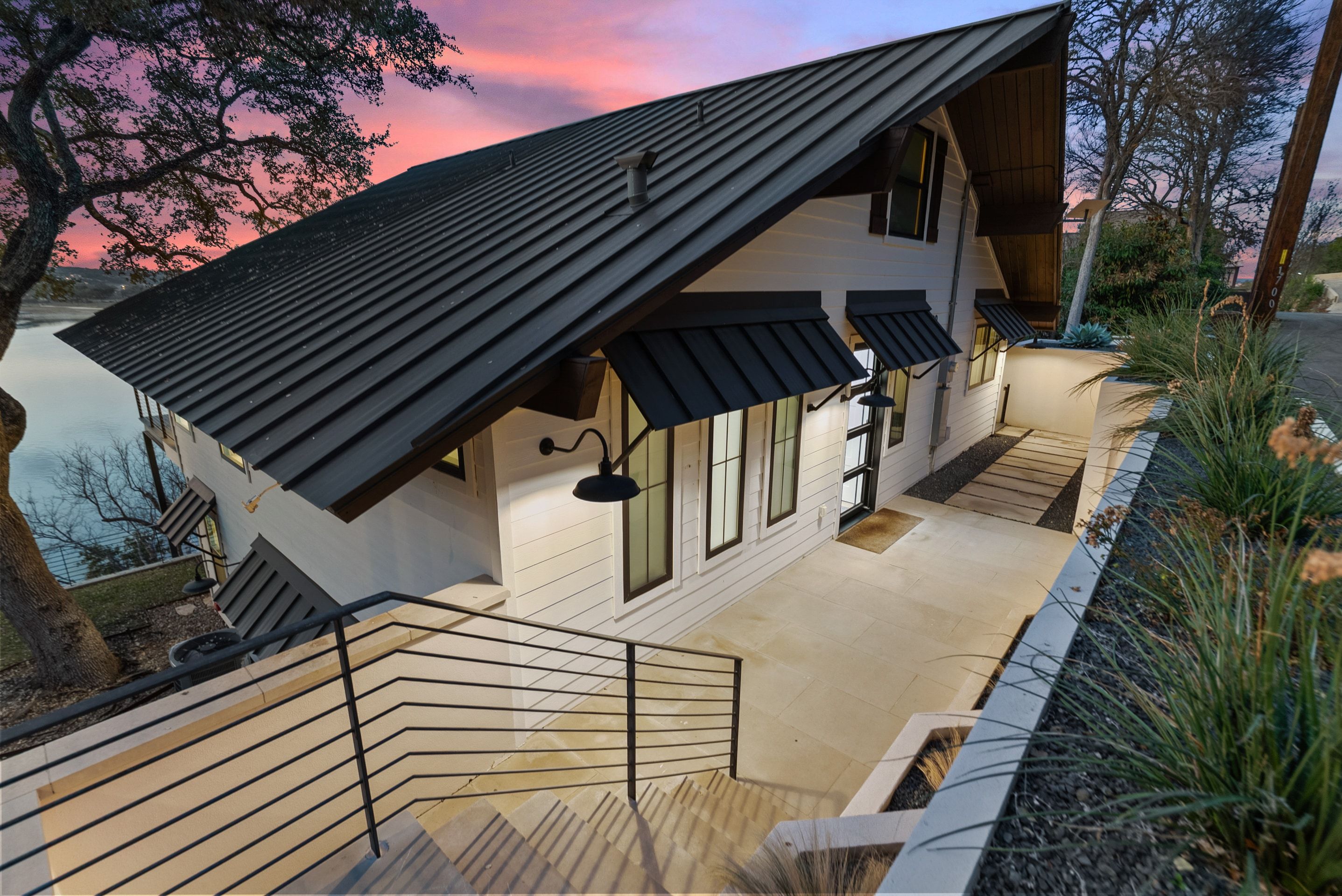 Set along the shoreline of Lake Travis, this property offers an impressive 176 feet of improved waterfront complete with a floating dock and convenient trolley access, making time on the water effortless. Wide open lake views stretch across the horizon, creating a setting designed for both quiet mornings and unforgettable sunset evenings.