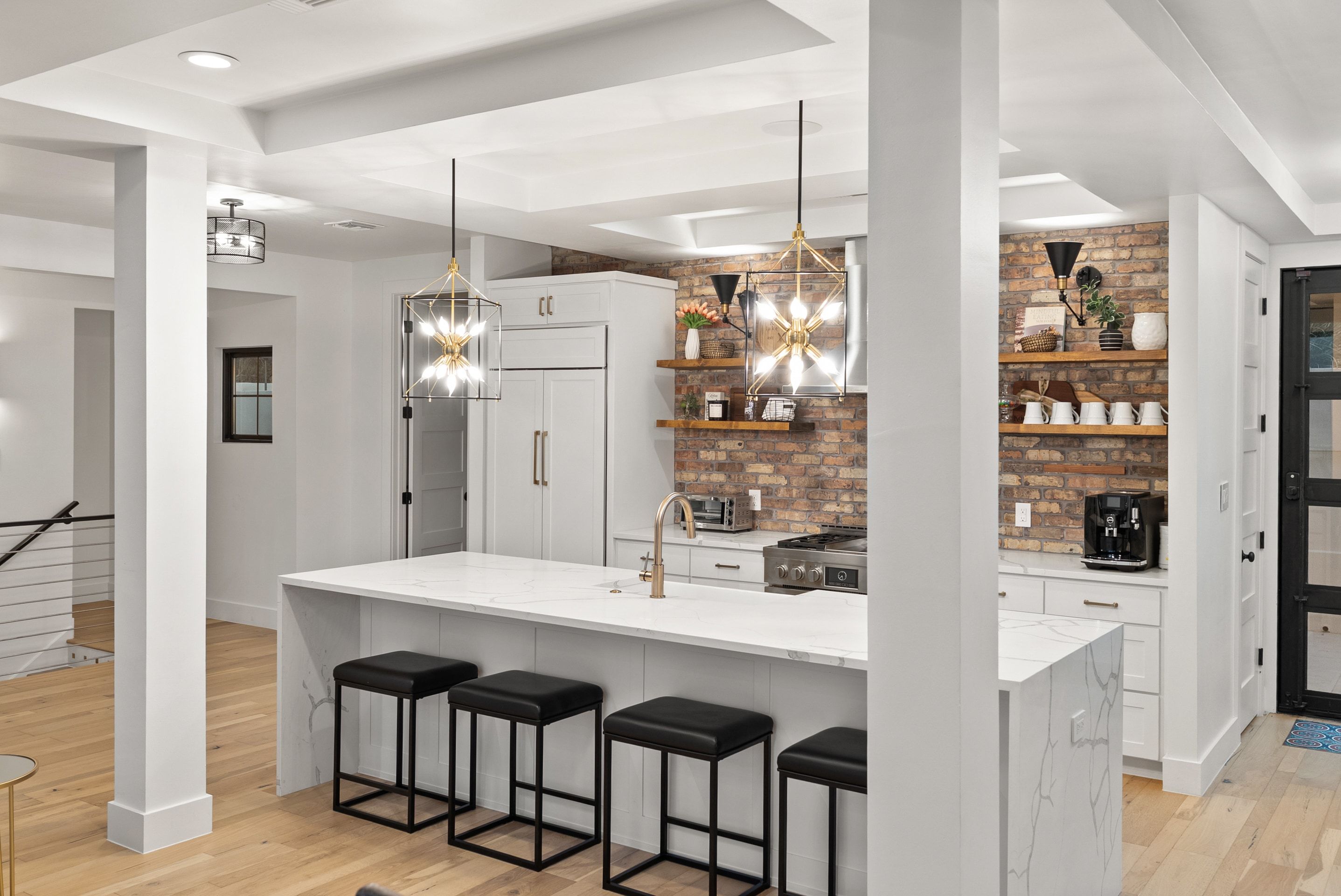 Inside, the home showcases a true custom design with bold architectural textures, soaring ceilings, and expansive windows that frame lake views throughout the living spaces. Thoughtful finishes, shiplap detailing, and custom lighting add warmth and character while maintaining a clean, modern lakehouse aesthetic. The open layout flows seamlessly from the living areas to the kitchen and entertainment spaces, making it ideal for hosting family and guests.