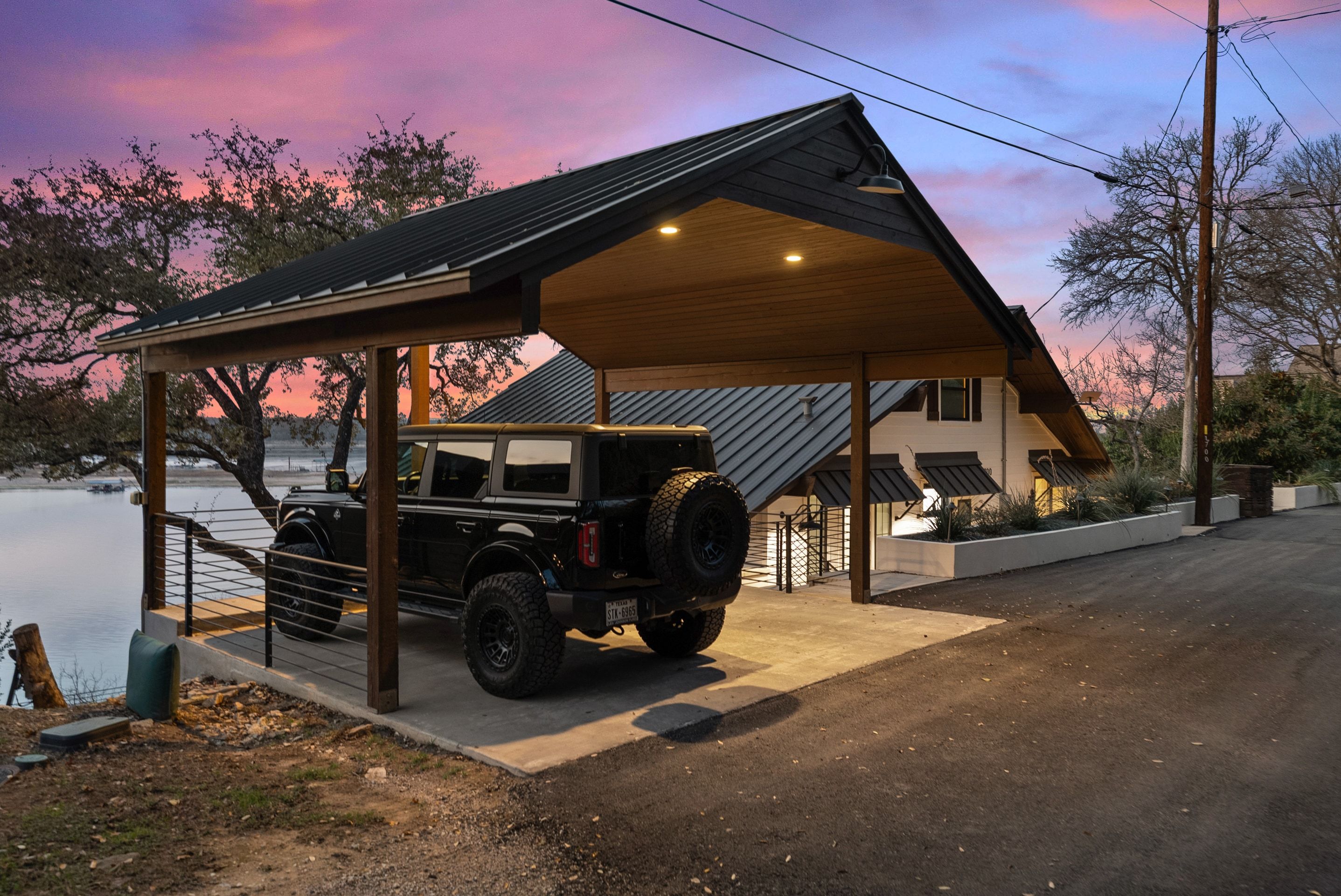 Practical features add even more appeal. The property offers a rare and generous parking layout for Lake Travis homes, making it easy to accommodate guests, boats, and lake gear. A durable metal roof and additional exterior storage further support the property’s functionality for full-time living or a high-end weekend retreat.
